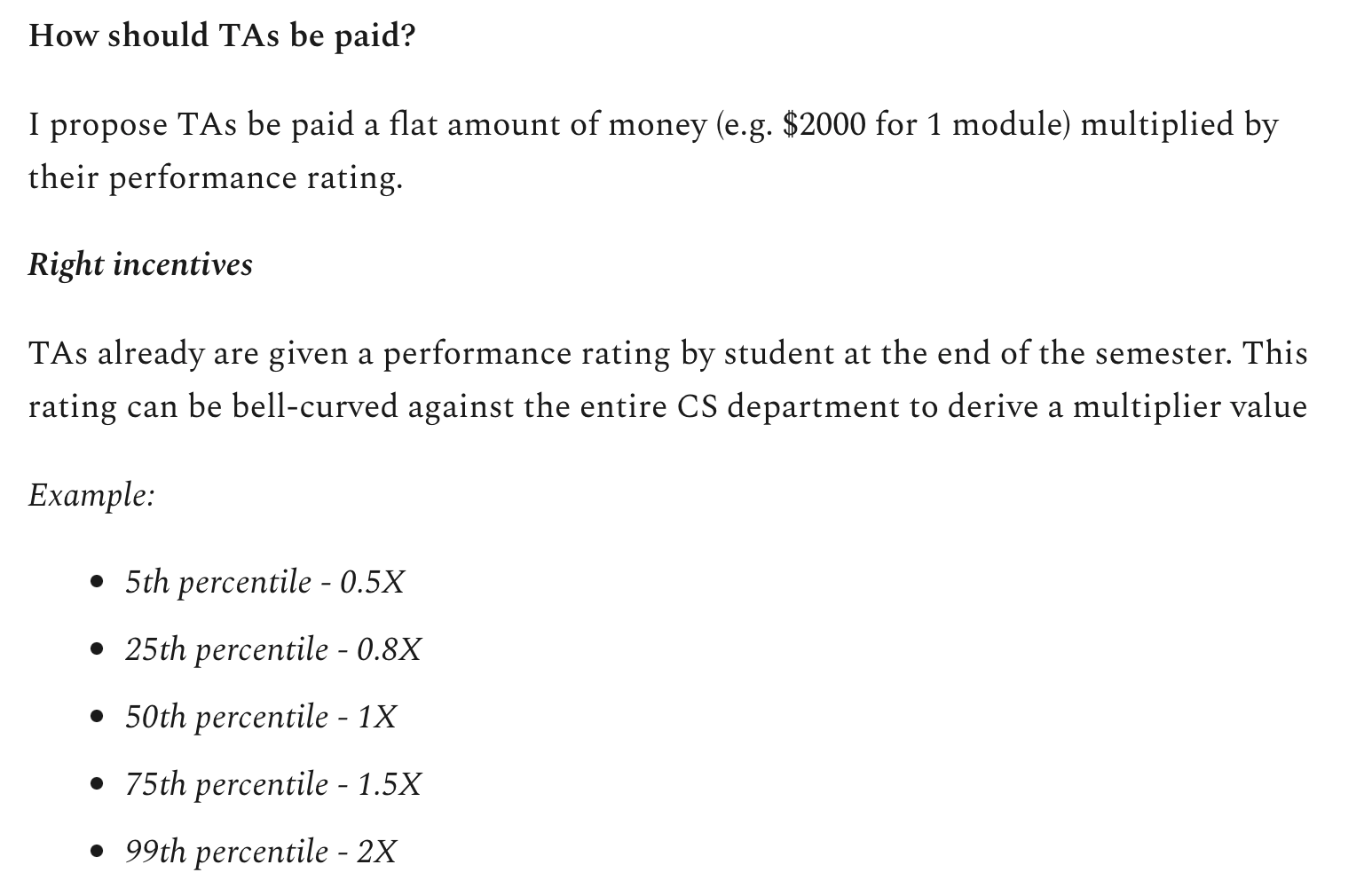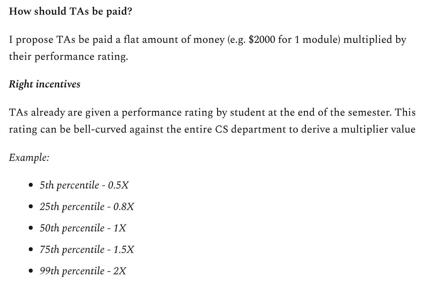 In a recent blog post of mine, I wrote about tying TA (Teaching assistant) compensation in NUS School of Computing to performance. I am writing this blog post to argue against performance-based TA compensation.